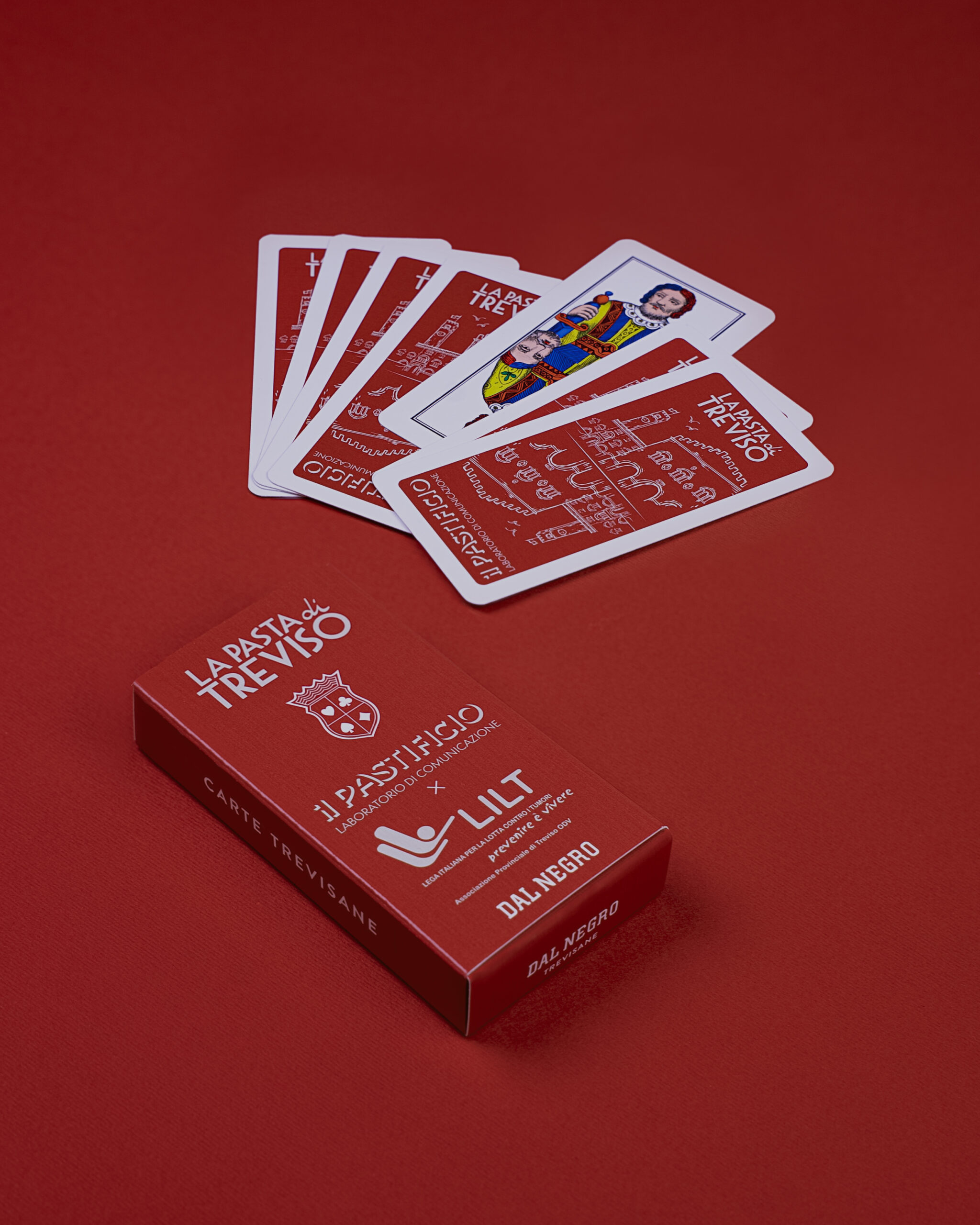 Accanto al piatto, infatti, potrete trovare un set di carte trevigiane Dal Negro, illustrato da Nicola Ferrarese: un oggetto da portare a casa che racconta la città, le sue storie e il suo immaginario.